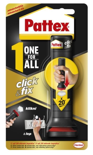 Pattex One For All Alick & Fix je novou generací montážního lepení, se kterým se lepení doma i venku stává zábavou pro každého. Během chvíle a bez námahy s tímto lepidlem přiděláte police, rámečky, dekorace, kořenky nebo věšáky. Stačí opravdu jen kliknout a lepit. Pouze přitlačíte dávkovač na lepenou plochu, nanesete lepidlo, chvilku jej přidržíte, těžší předměty raději zafixujete, necháte vytvrdnout a je přilepeno. Tak snadné to je! Samotné lepidlo je voděodolné, flexibilní, vysoce pevné a vhodné na téměř všechny materiály pro lepení v interiéru i exteriéru.  Jedno balení obsahuje 20 dávek, přičemž počet zbývajících kliků je vidět okamžitě na samotné tubě. Jeden bod lepidla dokáže okamžitě udržet předmět vážící až 300 gramů, konečná pevnost je až 20x vyšší! Takže se do lepicího šílenství můžete pořádně opřít. Lepidlo je určeno k lepení většiny savých i nesavých materiálů, jako je cihla, keramika, sádrokarton, dřevotříska, kov, sklo, plasty nebo dokonce i beton. Lze jej nanášet i na vlhké podklady. S montážním lepidlem Pattex Click & Fix se váš domov může snadno během chvilky proměnit v místo, kde se cítíte nejlépe. Stačí pouze kliknout.