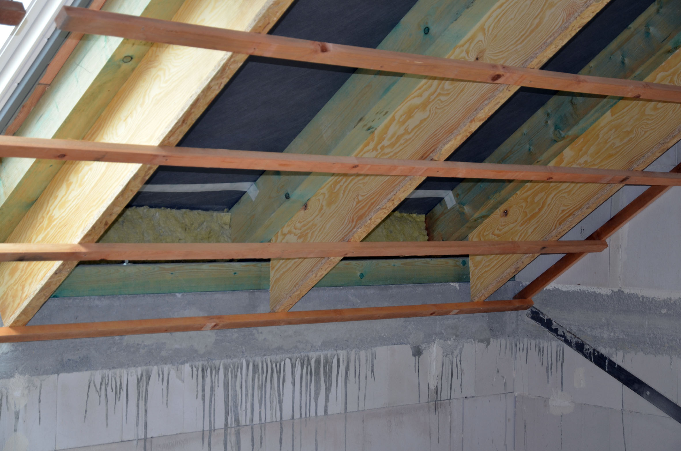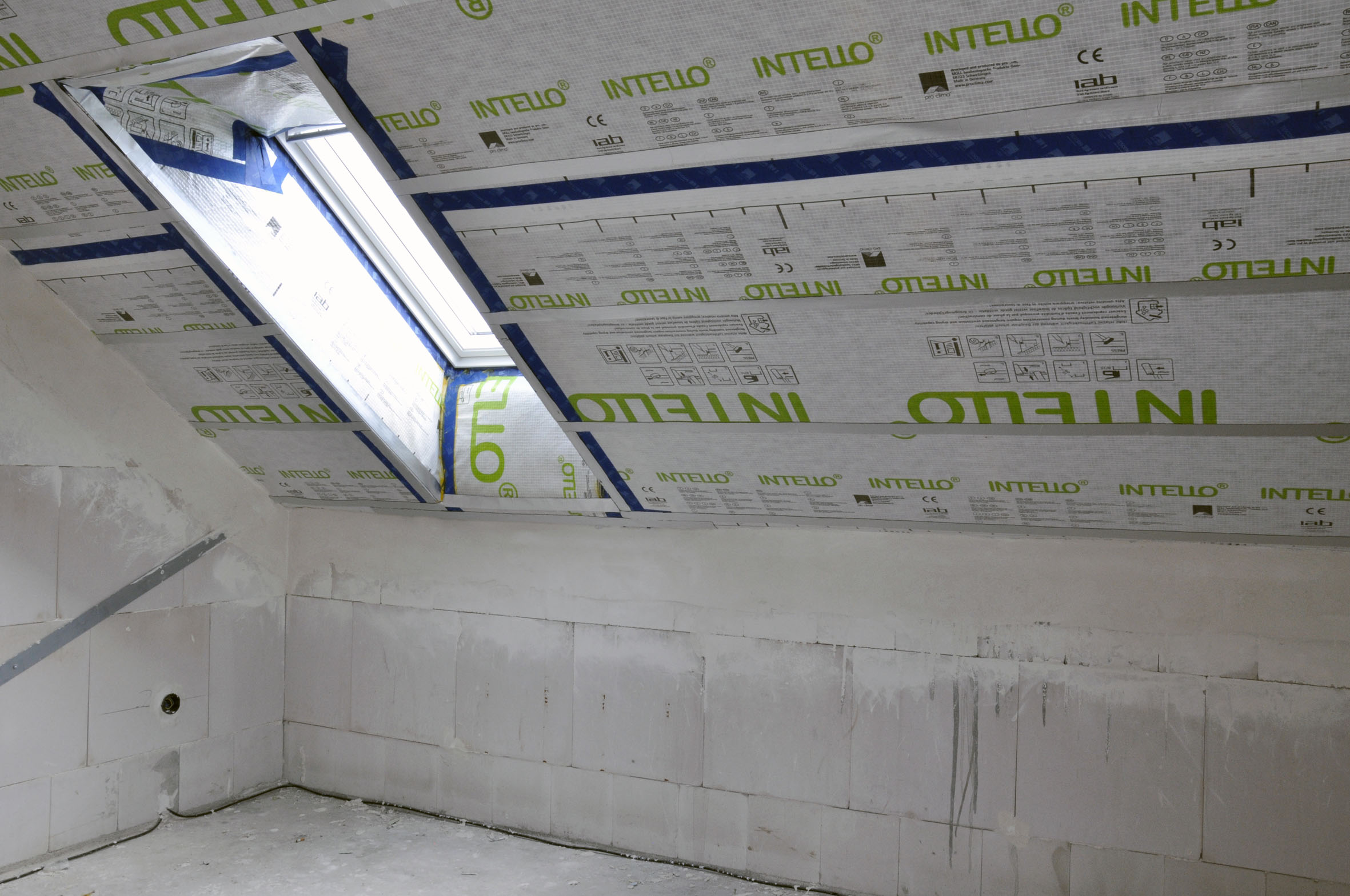 „Velkou roli při rozhodování o způsobu zateplení podkroví sehrál soused a jeho pozitivní zkušenosti“, vysvětluje majitel novostavby a dodává, že na zřetel bral i další pro něj důležité faktory. Byla to rychlost a pracnost technologie, samozřejmě cena a v neposlední řadě také skladba. „Přestože počítám s rekuperací vzduchu uvnitř domu, měl jsem obavy z vlhkosti, se kterou mám historicky špatné zkušenosti. Potřeboval jsem proto takovou skladbu materiálů, u které bych neměl obavy“. Kombinace foukané celulózové izolace Climatizer Plus® s parobrzdnou folií Intello®, kterou doporučila dodavatelská firma Jiří Nejedlý, se zdála jako ideální. „Podle mne je perfektní i ta skutečnost, že foukaná izolace zaplní celý prostor kolem trámů a bez větších problémů se dostane do každé dutiny, což zamezí výskytu tepelných mostů zejména v problémových místech“. Pomocí expanderů Hufer, což jsou výškově nastavitelné trámy, a parobrzdné folie, byla vytvořena dutina, do které se následně nafoukala 45cm vrstva izolantu Climatizer Plus®. Nejprve však bylo nutné všechny spoje folie utěsnit speciálními páskami Tescon. Finální pohledové plochy podkroví byly pak vytvořeny ze sádrovláknitých desek, na které přišla sádrová omítka.