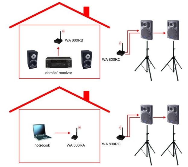 Naopak zmiňovaný WA 800RB je vysílač s linkovým stereo audio vstupem, určeným pro spolehlivé spojení s cizím zvukovým zdrojem, kupříkladu Mp3 nebo CD přehrávačem, sofistikovanou rozhlasovou ústřednou, moderním domácím Hi-Fi receiverem, ale také se sluchátkovým výstupem mobilního telefonu, tabletu či notebooku.