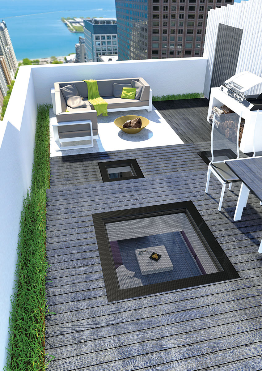 Okno DXW s pochozím sklem s protiskluzovou úpravou je vhodné například na střešní terasy. Speciální konstrukce oken se zvýšenou nosností a s protiskluzovým povrchem umožňuje bezpečnou chůzi po oknech. Montáž vhodná na střechách se sklonem 0-15°.